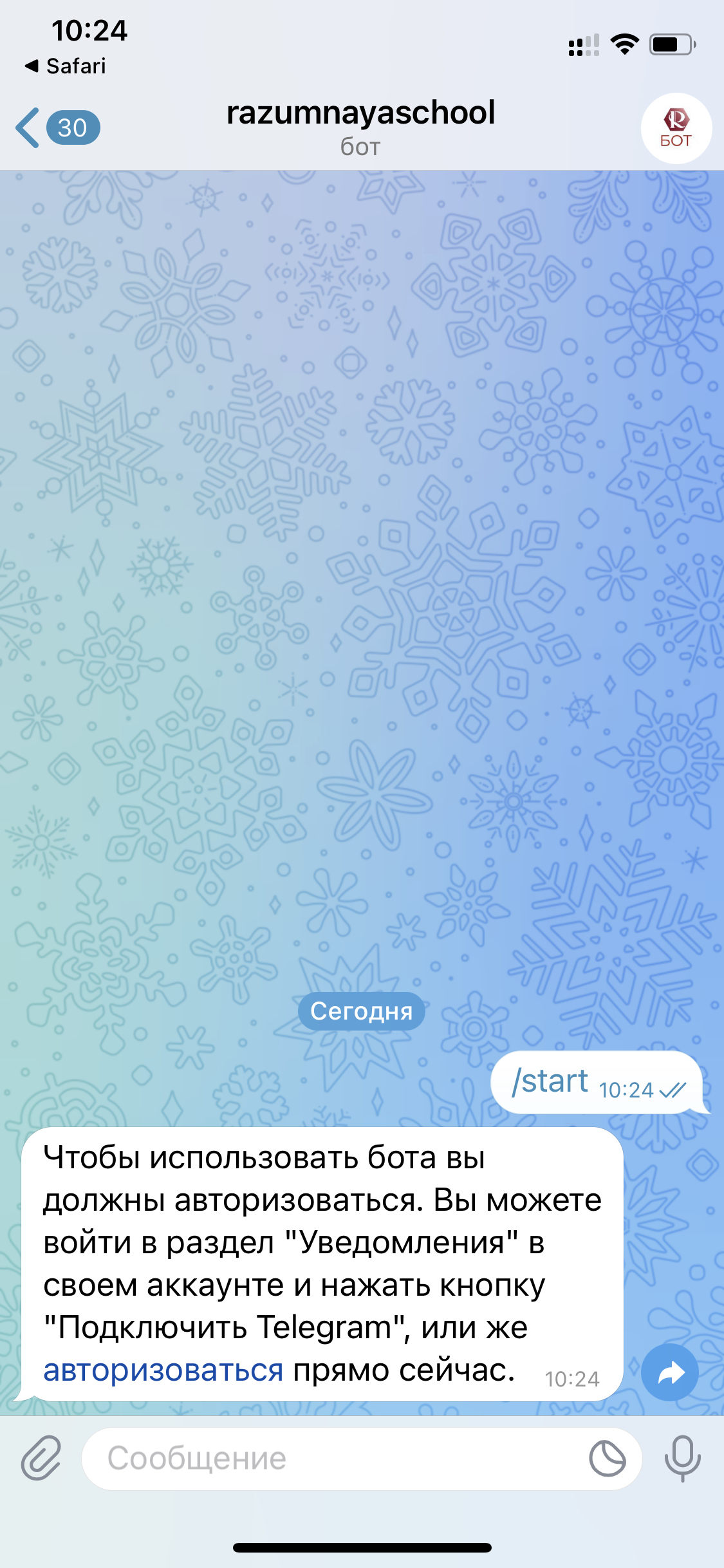 Шаг №1: Пожалуйста перейдите по ссылке в наш Телеграм Бот и нажмите кнопку "Начать" внизу диалога:https://t.me/razumnayaschoolbot?start=startЛибо нажмите на кнопку ниже ⏬